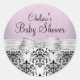 Pegatina de Baby Shower. Damasco negro con arco de plata y diamantes. Zazzle exclusivo. Personalizar con sus propios detalles. POR FAVOR, NOTE todas las imágenes planas! ¡¡NO tienen arcos, diamantes ni joyas de verdad!!