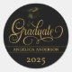 Elegante Pegatina de Graduación de Guiones. Presentando una gorra de graduación sobre un guión ornamentado "Graduado" en oro y el nombre de los graduados en oro en una cinta negra a través del pegatina. El año que está en la parte inferior del pegatina es el personalizable y el nombre. El fondo es negro con un texto dorado elegante y el año en curso. Este es un pegatina versátil y puede ser utilizado como "firma" o elemento especial en su correspondencia de correo, bolsos de favor, notas de agradecimiento u otros. Hacerlo un hito para recordar con un futuro brillante y emocionante con oportunidades por delante.