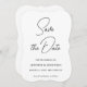 Plantilla simple minimalista moderna en blanco y negro con código QR del sitio web de su boda, invitaciones y papelería y anuncios / Salvar las fechas / Tarjeta de guardar la fecha impresa en soporte plano.