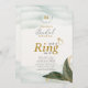 Elegante Oro de Verdor le puso un anillo en la tarjeta de juego de ducha de novia. Esta impresionante tarjeta de mesa es la manera perfecta de añadir un elemento interactivo y bonito a los juegos de ducha de novia. Diseñado para que se ajuste perfectamente a los soportes de las tarjetas o a los soportes de los clips (no incluidos), su diseño de doble cara presenta una imagen de espejo en la parte posterior. Esto garantiza una pantalla impecable desde cualquier ángulo, convirtiéndolo en una pieza verdaderamente completa y elegante. La tarjeta está muy bien personalizada con una cuenta regresiva final al gran día en un estilo único en la parte superior. A continuación, se muestra el nombre de la futura novia, seguido por "Bridal Shower" en una tipografía elegante. Las palabras "pon un anillo sobre él" se colocan en un guión en negrita junto a un encantador ilustracion de anillos, invitando a los clientes a participar en este clásico juego. También se incluyen reglas de juego y direcciones, todo ello contra la impresionante vegetación acuática y el diseño dorado de la colección. Esta elegante carta sirve como una hermosa pieza de decoración y como una divertida guía de juegos, asegurando que cada detalle de tu celebración sea sofisticado y sin esfuerzo.