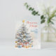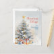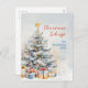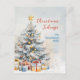 Un elegante árbol de Navidad con acuarela vintage se muestra en esta hermosa postal de vacaciones. Los baubles de bonito dorados resaltan el pino nevado y el topper es una estrella brillante. regalos y paquetes de bonito rodean la base del árbol. El saludo de la parte delantera de la postal es "Tidings Navidades", aunque se puede cambiar a otro saludo de temporada si se prefiere. Asegúrese de editar el nombre y la fecha de la familia de ejemplo.