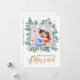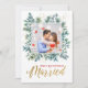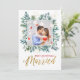 Una plantilla de tarjeta de Navidad moderna y romántica para recién casados con un tema de follaje invernal, que presenta un caprichoso marco botánico cuadrado de ramas de pino, eucalipto plateado y ramas de mirto doradas (este es un efecto digital) sobre la plantilla de foto en la parte frontal y lámina dorada sobre la palabra "casados" (este es un efecto digital, no lámina real). Plantilla para una segunda foto de boda en la parte trasera. Una tarjeta de Navidad y fiestas perfecta para recién casados que es elegante y refinada.