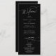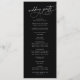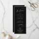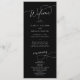 Este elegante programa de bodas negras y oscuras, con encanto, es perfecto para un boda sencillo. El moderno diseño minimalista presenta una caligrafía romántica atemporal sobre un sofisticado fondo negro oscuro con estilo bohemio de cuento de hadas. Personaliza tu plantilla de programa de boda con los nombres de la pareja, la fecha y ubicación del boda, mensaje de agradecimiento, orden de servicio, fiesta de boda y un monumento opcional "en memoria amorosa".