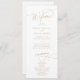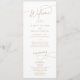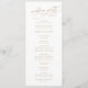 Este elegante programa de bodas blancas y doradas es perfecto para un boda sencillo. El moderno diseño minimalista presenta caligrafía romántica dorada y blanca con un estilo bohemio de cuento de hadas. Personaliza tu plantilla de programa de boda con los nombres de la pareja, la fecha y ubicación del boda, mensaje de agradecimiento, orden de servicio, fiesta de boda y un monumento opcional "en memoria amorosa".