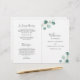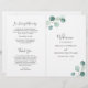 Elegante programa de bodas con presupuesto plegado, con un diseño sencillo, con una vegetación de eucalipto verde salado pintado de color agua en la esquina superior izquierda y en la esquina inferior derecha. Estos rústicos programas de bodas botánicas con un toque moderno son perfectos para un boda de primavera o verano.