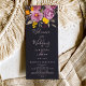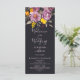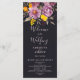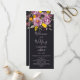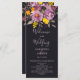Elegante programa de bodas florales púrpura en otoño con una caligrafía moderna y elegante, el boda de Script en flores moradas, naranjas y amarillas con follaje verde salado sobre negro oscuro