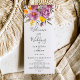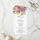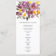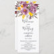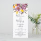 Elegante programa de bodas florales en el invierno de otoño morado con una caligrafía moderna y elegante, el boda de Script en flores moradas, naranjas y amarillas con follaje verde sabio.