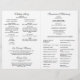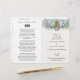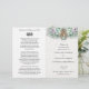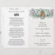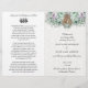 La imagen de delante muestra una imagen vintage de la Santísima Virgen y San José intercambiando sus votos bodas en un marco dorado con flores verdes de menta y lavanda. Un rosario está debajo. La parte trasera del programa tiene una hermosa oración para la novia y el novio. Los tres corazones sobre la oración representan a Jesús, María y San José. Adentro incluye una oración para recordar a los seres queridos que han pasado y un agradecimiento a todos los que han asistido.
