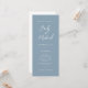Nuestra elegante tarjeta de programa de boda es perfecta para su celebración minimalista de bodas. Un hermoso guión de caligrafía blanca, emparejado con texto simple y limpio, se sienta en un suave fondo azul al frente de la tarjeta. El reverso blanco tiene un texto azul tonal, creando un aspecto elevado para complementar su elegante evento. Fácil y rápido de personalizar con sus propios detalles bodas.