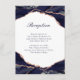 Proporcione a sus huéspedes todos los detalles de su recepción nupcial con esta elegante tarjeta de recinto con escritura moderna, tonos clásicos de ágata azul marino con venas metálicas de Relieve metalizado oro de rosa y estrellas brillantes.