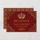 Elegante tarjeta de recepción con un elegante borde dorado ornamentado y hermosa corona en un fondo rojo oscuro.