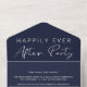 Elegante elegancia, invitación boda y recepción posterior a la boda todo en una sola invitación con tipografía crema clara contra fondo azul marino oscuro. "Feliz eterno después del Fiesta" está escrito en una mezcla de tipografía simple y escritura moderna. Una tarjeta postal RSVP desgarradora proporciona una respuesta cómoda, ecológica y sin sobres de sus invitados.