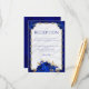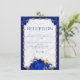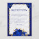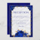 Proporcione detalles importantes sobre la recepción de su boda, con esta elegante tarjeta de invitación, que incluye una higuera dorada enmarcada en una suave satén blanca coronada por rosas azules. El fondo metálico azul real simulado realza el lujoso ambiente.