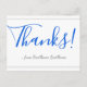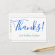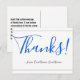 Este elegante y respetable diseño de tarjetas postales de agradecimiento incluye el mensaje "¡Gracias!" en texto de color azul en el frente, junto con un mensaje personalizado en la parte posterior. Se podría usar para mostrar agradecimiento a alguien que ha hecho un acto especial.