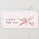 Certificado de regalo moderno y elegante para peluqueros con tijeras falsas de oro rosa de cobre, rosas rosas rosas rosas y blancas y elegante fuente caligráfica.