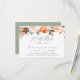 Mejora tu papelería boda con nuestras elegantes tarjetas RSVP de boda floral de otoño. Con un borde superior de flores acuáticas pintadas a mano, suculentos y hojas en una cálida paleta otoñal de color rosa, melocotón, naranja, crema, marrón y verde, estas tarjetas RSVP complementan maravillosamente su tema de bodas en otoño. Personalizar con la fecha deseada de RSVP, acepta/rechaza la redacción personalizada y las opciones de cena opcionales para una experiencia perfecta. En el reverso se aprecia un fondo verde y sólido que aporta un toque moderno a la decoración. Perfecto para las parejas que buscan una mezcla de encanto rústico y elegancia, estas tarjetas RSVP son una elegante incorporación a su suite boda.