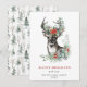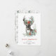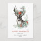 Tarjeta festiva de Navidad con ciervo y poinsettia para las fiestas.