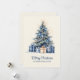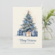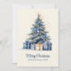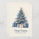 Celebra la temporada con un toque moderno de tradición. Esta tarjeta de Navidades de dos caras cuenta con un elegante árbol de decoración azul y dorada con regalos envueltos por debajo. La parte posterior incluye un sutil ilustracion de correspondencia y un mensaje personalizado en un tono azul de coordinación. Perfecto para todo aquel que ame un ambiente frío y elegante de invierno. Personalice el texto para que sea exclusivo suyo, ideal para saludos de amigos, familiares o profesionales.