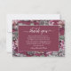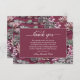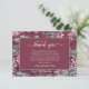 Una elegante tarjeta de agradecimiento funeraria presenta un fondo rojo borgoña con un rico patrón de estanque de nenúfares. Las flores son rosadas polvorientas. Gracias está escrito en bella caligrafía. Es muy fácil reemplazar tu sentimiento personal por el texto de muestra. No dudes en enviarme un mensaje si necesitas algún elemento de coordinación.