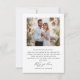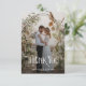 Tarjeta de agradecimiento de boda moderna y elegante. Diseño característico foto, escritura tipográfica superposición gracias en letras blancas, nombres, fecha boda en el frente. Personalice más con su mensaje y otra foto en la parte posterior.