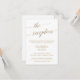 Esta elegante tarjeta de recepción de caligrafía dorada es perfecta para una boda en otoño. El diseño neutro cuenta con una tarjeta minimalista decorada con una romántica tipografía de Relieve metalizado de imitación de oro. Personalice esta tarjeta de gabinete de detalles con su información de recepción e incluya también la dirección de su sitio web boda. Nota: Este diseño no tiene Relieve metalizado oro real. Es un gráfico de alta calidad hecho para parecer un Relieve metalizado dorado.