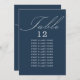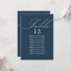 Tarjeta de asiento de mesa de boda azul marino con caligrafía elegante y tipografía editable. Diseño minimalista sencillo y moderno que se adapta a los colores bodas. La tabla está escrita a mano y la plantilla está lista para que edite el número de tabla y la lista de asientos de invitados.