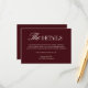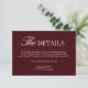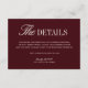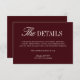 Proporcione a los huéspedes toda la información esencial en estilo con esta elegante tarjeta de detalles de boda. Con un fondo burdeos profundo y una tipografía de sísmo y escritura refinada, este lugar es perfecto para bodas formales, vitícolas o nocturnos. Utilícelo para compartir instrucciones de viaje, alojamiento en hotel, instrucciones RSVP o enlace a su sitio web boda. Personalizable completo. Coordenadas con la "Sabrina" correspondiente: siga el enlace de esta página para ver la señalización coincidente, menús, invitaciones y más. ・ Se crearon maquetas para este diseño usando Midtrip AI.