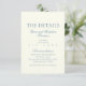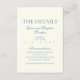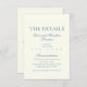 Añada un toque de elegancia eterna a su papelería boda con esta polvorienta tarjeta azul de detalles, diseñada en un estilo minimalista clásico. Con una sofisticada tipografía de guiones y delicados y suaves acentos azules polvorientos, esta tarjeta de detalles es el complemento perfecto para su suite de invitados a la boda. Ya sea que comparta información sobre alojamiento, direcciones o su registro de bodas, esta tarjeta simple y elegante garantiza a sus huéspedes todos los detalles importantes de una manera refinada y elegante. Diseñada con un diseño minimalista, esta tarjeta de detalles combina líneas limpias y un guión elegante para dar a su papelería un aspecto sofisticado y subestimado. El suave azul polvoriento evoca un ambiente sereno y romántico, por lo que es ideal para los bodas con una temática rústica, boho o moderna de moda. Características principales: diseño minimalista clásico con tipografía de escritura delicada para un aspecto refinado Acentos de color azul polvoriento suave que exudan elegancia y detalles de Personalizable de encanto para elementos bodas como alojamiento, direcciones o información de registro Opciones de papel premium que incluyen mate, lino y acabados brillantes para un ambiente de lujo Coordenadas perfectamente con nuestras polvorientas invitaciones de boda azules y suite completa de papel boda Impresión de texto de alta calidad y colores vivos Esta polvorienta tarjeta azul de detalles es la manera ideal de compartir información importante con sus huéspedes mientras mantiene una estética cohesiva y pulida. Ya sea que usted esté organizando una ceremonia íntima o una gran celebración, el diseño minimalista de esta tarjeta se integrará perfectamente en su tema boda general. Perfecto para: bodas azul turbio diseños bodas Minimalistas Parejas planeando un boda de moda rústico o bodas modernos Bodas de destino que necesitan un diseño de fondo sutil pero elegante. Proporcionar detalles esenciales en el estilo, sin abrumar su suite de invitados........................................................................................................................................... Con su polvoriento diseño de guiones azules y estilo minimalista clásico, ofrece belleza y funcionalidad, asegurando que sus huéspedes reciban toda la información importante con elegancia y gracia.
