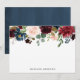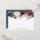 Elegante tarjeta de papelería personalizada con un borde superior de flores de color burdeos, rosa negro y azul marino de color azul marino complementado con hojas verdes. En el reverso de la papelería floral se ve el fondo de una acuarela azul marino. Personalice con su nombre, monograma u otro texto para un diseño personalizado.