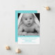 Elegante tarjeta de foto de anuncio de nacimiento de niño personalizado hecha en blanco con una zona de fotos decorada con una cinta de puntos de polka azul y blanco, en el fondo. Excelente manera de enviar a amigos y familiares la primera foto de tu recién nacido. Personalizado aqua texto está listo para personalizar con toda su información.