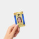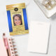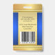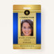 Elegante placa de identificación de fotos de diseño dorado y azul con espacio para tu foto y logo personalizado. En la parte posterior puede agregar un código de barras personalizado o código QR y textos adicionales o eliminar las plantillas. También puede copiar y pegar el diseño y las fotos de la parte delantera a la trasera si lo desea.