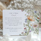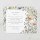 Esta elegante tarjeta de información sobre bodas cuenta con un impresionante diseño de flores silvestres, perfecto para un boda romántico, ajardinado o rústico. En la parte delantera de la tarjeta se exhiben delicados flores silvestres en suaves tonos pastel, como lavanda, melocotón, amarillo y azul, todo muy bien ilustrado en un estilo acuático pintado a mano. La parte trasera de la tarjeta continúa con el tema floral, proporcionando amplio espacio para detalles adicionales como direcciones, detalles de la ceremonia o preferencias de regalo. Los elementos botánicos serenos y la tipografía clásica crean un diseño armonioso y atemporal que complementa cualquier suite de invitados a la boda. Esta tarjeta de información es una manera encantadora de compartir detalles importantes con sus huéspedes mientras se añade un toque de belleza natural a su papelería boda.