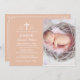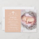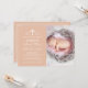Tarjeta fotográfica de invitación al bautismo con un elegante diseño giratorio de fondo beige.