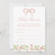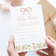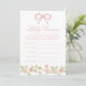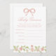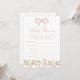 Añada un elemento divertido e interactivo a su ducha de bebé con esta tarjeta de juego Elegant Pink Bow Baby Guesses. Con una suave acuarela de color rosa en la parte superior, "Baby Guesses" con un elegante guión de caligrafía, y un polvoriento jardín floral rosa con exuberante vegetación en el fondo, este encantador diseño es perfecto para una ducha de bebé encantadores, vintage o con temática de jardín. Los huéspedes pueden escribir sus predicciones para la fecha de nacimiento, hora, peso y duración del bebé, convirtiéndolo en un recuerdo memorable para los futuros padres. Personalizar las instrucciones para un toque personal y crear un juego delicioso que todos disfrutarán.