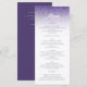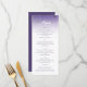 Elegante carta de bodas con un rico fondo violeta adornado con un adorno de encaje damasco en la parte superior, acompañado de una elegante tipografía de escritura blanca, que crea una presentación sofisticada y ornamentada. La disposición destaca una refinada comida boda de varios platos: entrantes orgánicos frescos, filete de ternera a la parrilla, medallones de pollo costrado con hierbas, entrantes de mahi mahi cortados, almendras y una firma postre de pasteles boda de vainilla, lo que lo convierte en una elección atemporal y elegante para recepciones formales.
