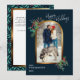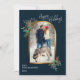 Esta elegante tarjeta plana de Navidad cuenta con un marco de foto de arco dorado, rodeado de sencillas hojas de invierno y bayas y el mensaje, "Felices Fiestas". Hazlo verdaderamente único con el nombre de tu familia y fotografía. Agrega un mensaje personal en la parte posterior o déjalo en blanco eliminando el texto en la sección Personaliza esta