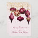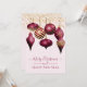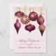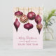 Esta elegante tarjeta navideña presenta hermosos adornos navideños en burdeos y dorados con luces de cuerda dorada en un suave fondo rosado. El texto "Feliz Navidad y Feliz Año Nuevo" al frente, y el saludo personal y los nombres de familia al revés se pueden cambiar fácilmente haciendo clic en "Personalizar". Perfecto para las vacaciones.