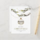 Esta elegante tarjeta Navidad presenta un diseño minimalista con un único adorno de plata colgado bajo la vegetación. Las delicadas ramas y los tonos suaves le dan un toque festivo y sofisticado. "Feliz Navidad" está impreso en elegantes letras, creando un cálido y acogedor saludo de vacaciones.