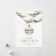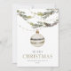 Esta elegante tarjeta Navidad presenta un diseño minimalista con un único adorno de plata colgado bajo la vegetación. Las delicadas ramas y los tonos suaves le dan un toque festivo y sofisticado. "Feliz Navidad" está impreso en elegantes letras, creando un cálido y acogedor saludo de vacaciones.