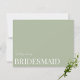 Estas elegantes y minimalistas tarjetas de proposición de dama de honor presentan una tipografía de escritura moderna y texto limpio para un diseño verde sabio sencillo y elegante que le encantará. Añade texto personalizado para proporcionar cualquier información adicional necesaria para tus invitados. Siéntase libre de enviarme cualquier pregunta relacionada con el diseño - ¡estaré encantado de ayudar!
