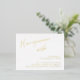 Simple tarjeta de gabinete de Boda de Relieve metalizado dorado con "Deseo de luna de miel" en un elegante guión manuscrito en la parte superior izquierda junto con su mensaje personal en alineación derecha en la esquina inferior derecha. La letra a mano de moda añade un toque romántico a este diseño minimalista. Esta tarjeta es una buena manera de pedir educadamente a tus invitados que contribuyan a tu fondo de luna de miel en lugar de un regalo.