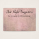 Aquí hay un accesorio divertido para recoger para su fiesta de compromiso o ducha conjunta: tarjetas de sugerencia de noche de cita en las que los huéspedes pueden escribir notas personales a la novia y al novio. En la parte delantera se lee "Sugerencias de la noche de la fecha" en un elegante y moderno tipo de letra de guión; este tipo de letra es editable para que pueda elegir otro si lo prefiere... o incluso escribir un mensaje diferente. Debajo hay un lugar para sus nombres. Todas las palabras se presentan en color negro. Tanto la parte delantera como la trasera de la tarjeta se cubrieron con una sutil imagen de grunge angustiada que cuenta con diseños de encaje y burlap, junto con elementos rosados y beige. La textura estaba cubierta por un revestimiento blanco opaco, con el fin de aligerar la superficie y proporcionar un gran contraste para el texto impreso y escrito en la superficie. La parte trasera se dejó sin palabras, proporcionando un espacio para notas personales escritas a mano más largas que sus invitados deben proporcionar. Por favor, no dudes en contactarme si tienes solicitudes especiales o necesitas otros artículos. También estoy contento de ayudar con la personalización de estas tarjetas si lo necesitas. // Diseñado por Melody Watson para la Muserie del Papel