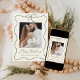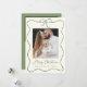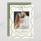 Celebre la temporada con nuestra tarjeta de vacaciones de fotos con crema y cinta verde 2. Este encantador diseño muestra tu preciada foto familiar rodeada por un festividad de cinta verde, con un arco en la parte superior. El fondo crema destaca maravillosamente el saludo escrito a mano "Feliz Navidad" en escritura verde, que puede ser personalizado con un saludo de su elección. Añade tu apellido para un toque personal. En la parte trasera hay espacio para una segunda foto y un mensaje sincero. ¡Ideal para compartir la alegría con los seres queridos esta temporada de vacaciones!