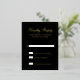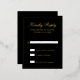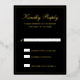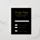 Tarjeta RSVP de boda de Relieve metalizado en negro y oro de estilo tradicional con un diseño sencillo y clásico con "Kindly Reply" en una caligrafía elegante dentro de un borde delgado. La plantilla permite a sus invitados indicar el número de asistentes. Esta elegante tarjeta de respuesta es perfecta para un boda formal.