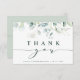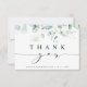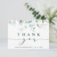 Esta tarjeta de agradecimiento incluye eucalipto de color agua pintada, hojas botánicas verdes y azules claras con caligrafía moderna. Perfecto para bodas, cumpleaños, graduaciones y otros eventos.