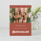 Un simple y elegante obsequio con una tarjeta de fotos para agradecer a su dama de honor. Un tema de moda retro: adoptar este diseño tipográfico vintage y elegante para su papelería Boda, con un tema de color terracota. Fácil de mezclar y emparejar con nuestra papelería similar disponible en color rosa melocotón, naranja oxidado y azúcar marrón. Personalizable completamente los colores y fondos de texto.