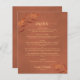 Estos bonitos menús bodas son sencillos, elegantes y elegantes, a la vez que asequibles y asequibles. Presentan un diseño rústico con hojas de acuarela naranja de óxido pintadas a mano y caligrafía de escritura sobre un fondo de terracota de mármol. Perfecto para una recepción otoño o otoño.