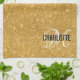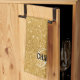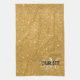 Elegante toalla de cocina purpurina dorada con un monograma de escritura blanca y un nombre negro. Personaliza con tu nombre inicial.