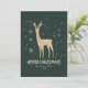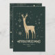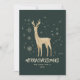 Este elegante y moderno diseño no fotográfico de Green y Gold Reindeer Merry Christmas cuenta con un reno rodeado por un elegante conjunto de copos de nieve y estrellas. La parte trasera de la invitación es un patrón de los mismos ilustraciones de Navidades. Se puede personalizar el color de fondo y el texto. Este diseño es perfecto para una tarjeta de Feliz Navidad. Ver toda la colección coincidente!