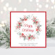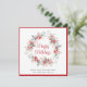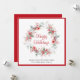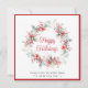Elegante tarjeta de bienvenida para Navidades con una corona de agua de flores y bayas rojas y vegetación de temporada verde salada. "Felices Fiestas" está escrito en un elegante guión rojo. Personalice su saludo y nombre en una tipografía sencilla y moderna.